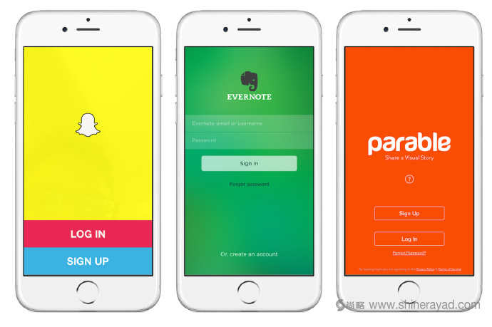 顏色方案決定了應用的形象,它應該是品牌主題色的擴展。它是視覺設計的核心,因為應用所有可見的地方都會使用這些顏色。首先,你需要選擇一個能增強品牌形象的主題色。例如,Evernote的主題色是綠色。然后,你應該圍繞這個主題色來創建顏色方案。亮色可以吸引人的目光,所以適合那些消費導向的應用;中間色可以讓人把精力集中在信息本身,所以更適合專業性的應用。Parable的主題色是“Tangelo橙”,因此我們選擇了灰度作為主要顏色方案,這也符合我們一貫的時尚創意。另一個例子是SnapChat,它使用了華麗的亮色方案來吸引青少年用戶。