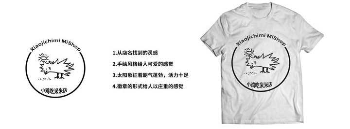 你要跟阿黃說。你看,你的店名叫小雞吃米,Logo的主元素就是小雞吃米,很貼切。我采用了手繪的風(fēng)格,給人很可愛的感覺。Logo中還有一個(gè)太陽,象征著朝氣蓬勃,活力十足。Logo整體又是徽章的形式,給人很莊重的感覺,說明你這個(gè)人很靠譜。