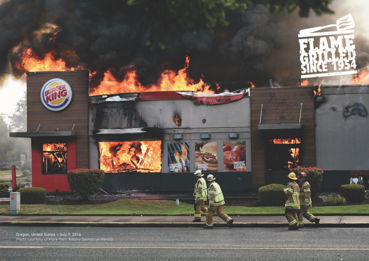 尚略廣告策劃設計公司分享的這則廣告宣傳的是漢堡王的火焰燒烤技術,采用夸張的手法凸顯店家的技術賣點,以火災現場作為圖片選擇,既具有話題性又有色彩感,十分吸人眼球,并用上1954這個數字,告知了消費者本店的燒烤技術由來已久,經過不斷的改良提升才發展至此,無形中提升了消費者對漢堡王品牌的信任度。
