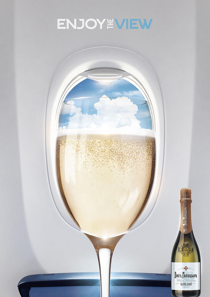 在你正經歷一段商務飛行時,不失為一道美麗風景線的窗外天空可以幫助你打發無聊時光。但享受旅程中的廣闊視野還有更多選擇。本案例中的美酒品牌在航空雜志上刊登的一則平面廣告, 窗外明媚的天空風光倒映在酒杯中,凸顯出酒的色澤的晶瑩透亮。一邊欣賞著窗外的風景,一邊品嘗著美酒,這則平面廣告利用場景打造 ,帶給受眾美好的產品想象。