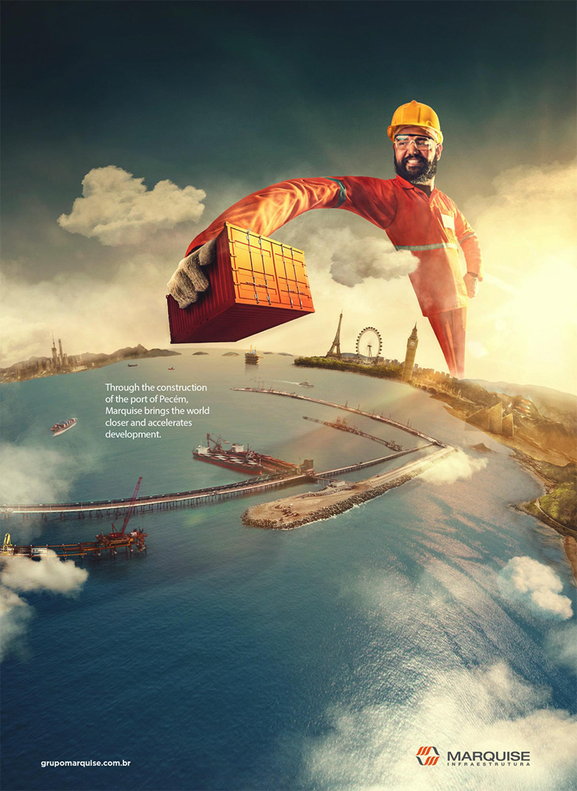 由Bravo / BBG廣告公司,為侯爵夫人集團(Marquise Group)創建的平面廣告創意設計,以慶祝巴西東北部的Porto do Pecem佩切姆港開通。廣告設計作品用一個拿著集裝箱的超長拉伸的手臂,環繞地球來表現拉近世界,廣告畫面非常有創意和視覺美感。