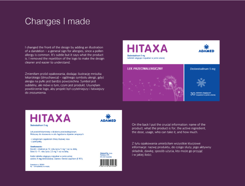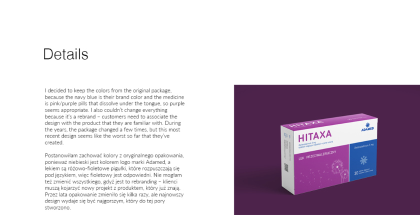 這是一種治療輕度過敏的藥, 其藥品包裝已經上市了一段時間了,但設計師對這個包裝設計不是太滿意,所以決定稍微改變一下,讓它更適合病人。包裝設計使用了分隔色塊的設計,一塊可以作為主色,一塊可以作為變色處理。這也是藥品包裝設計里面常用的手法。