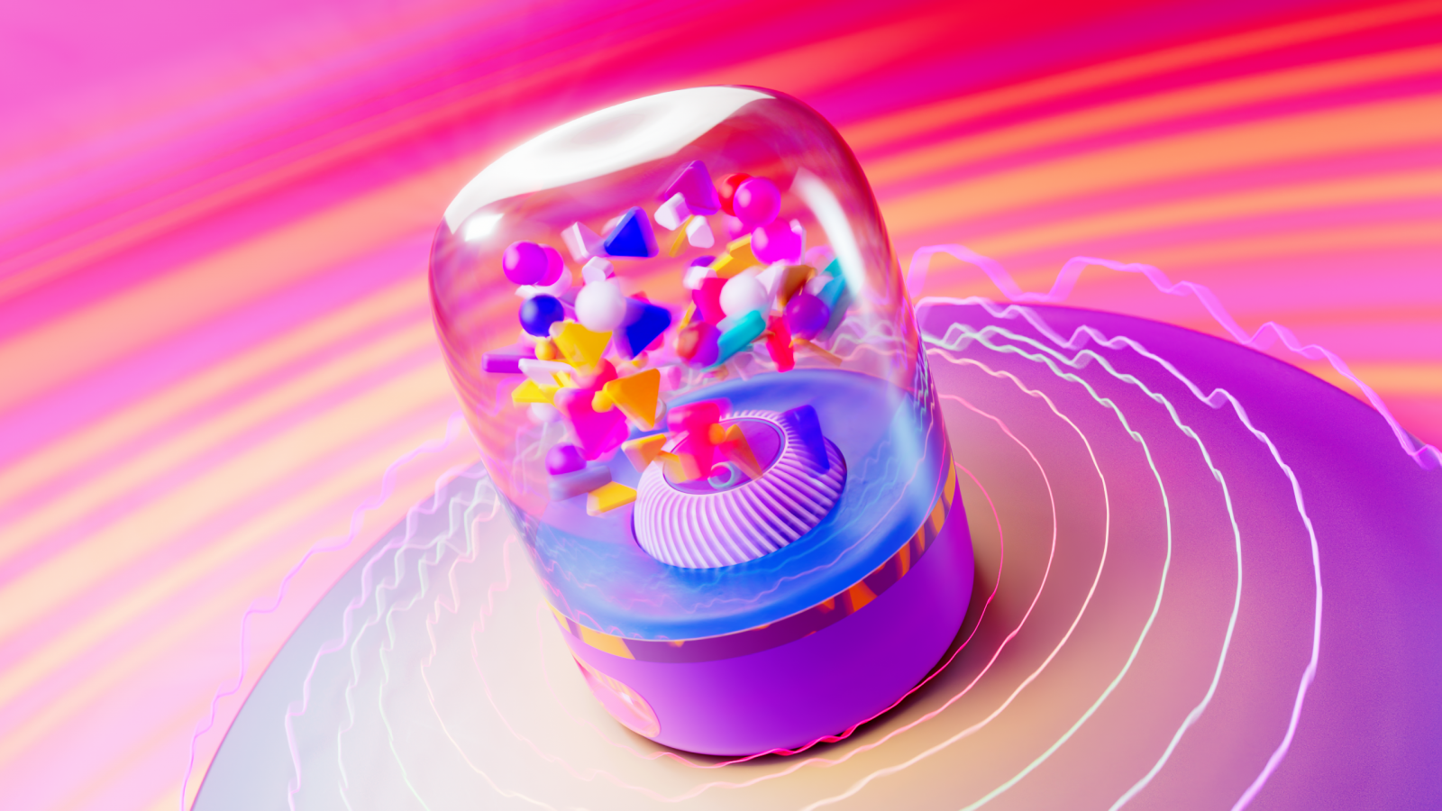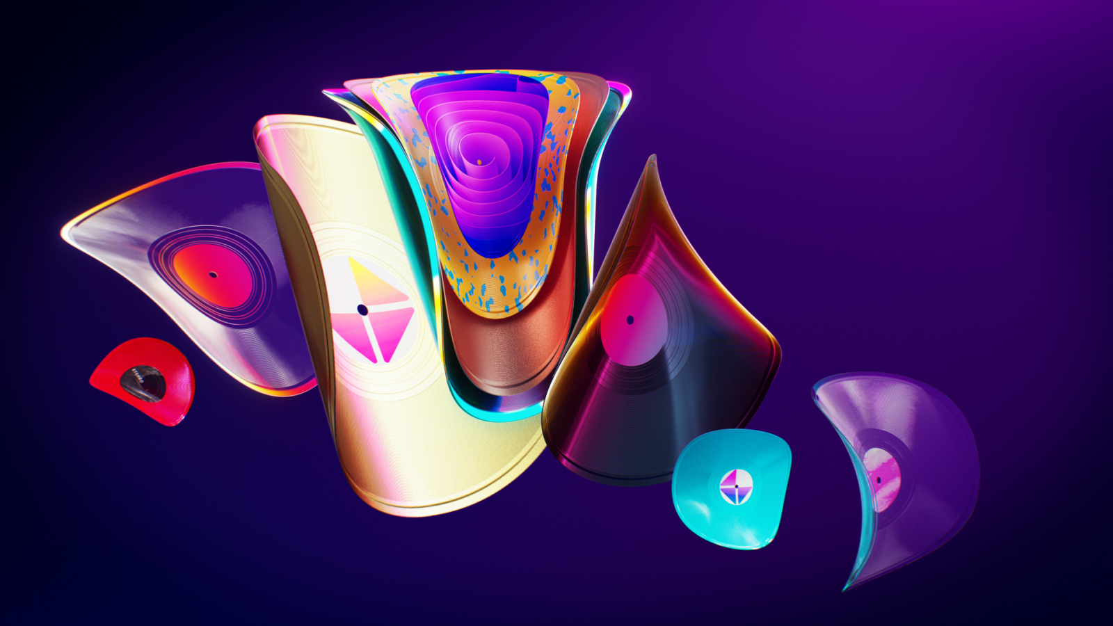 Golden Dozen 圖表設計的想法是基于 90 年代和 2000 年代常見用具的超現實體現:靈活的黑膠唱片、彩色磁帶倒帶鉛筆和飛行鏡盤。全息風格的物體被“熔化”成真金,形成“金”計劃的新標志。