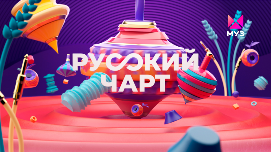 更新也影響了電視頻道的主要圖表——他們的風格變得更加周到,這樣當切換到 MUZ-TV 時,觀眾可以立即了解節目的情緒。例如,“Russian Chart”的視覺形象關聯地追溯了“a la rus”的主題——圖形包的主要女主角是陀螺,或者更確切地說,是一個完整的五彩“家庭”,它代表了圖表的命中。